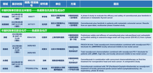 卡瑞利珠单抗联合AG真人医药的另一款创新药法米替尼在甲状腺癌和结直肠癌领域有2项研究被接收为壁报,另有卡瑞利珠单抗联合化疗的4项研究在肺癌、结直肠癌、头颈癌和阴茎癌领域的研究被接收为5份壁报。